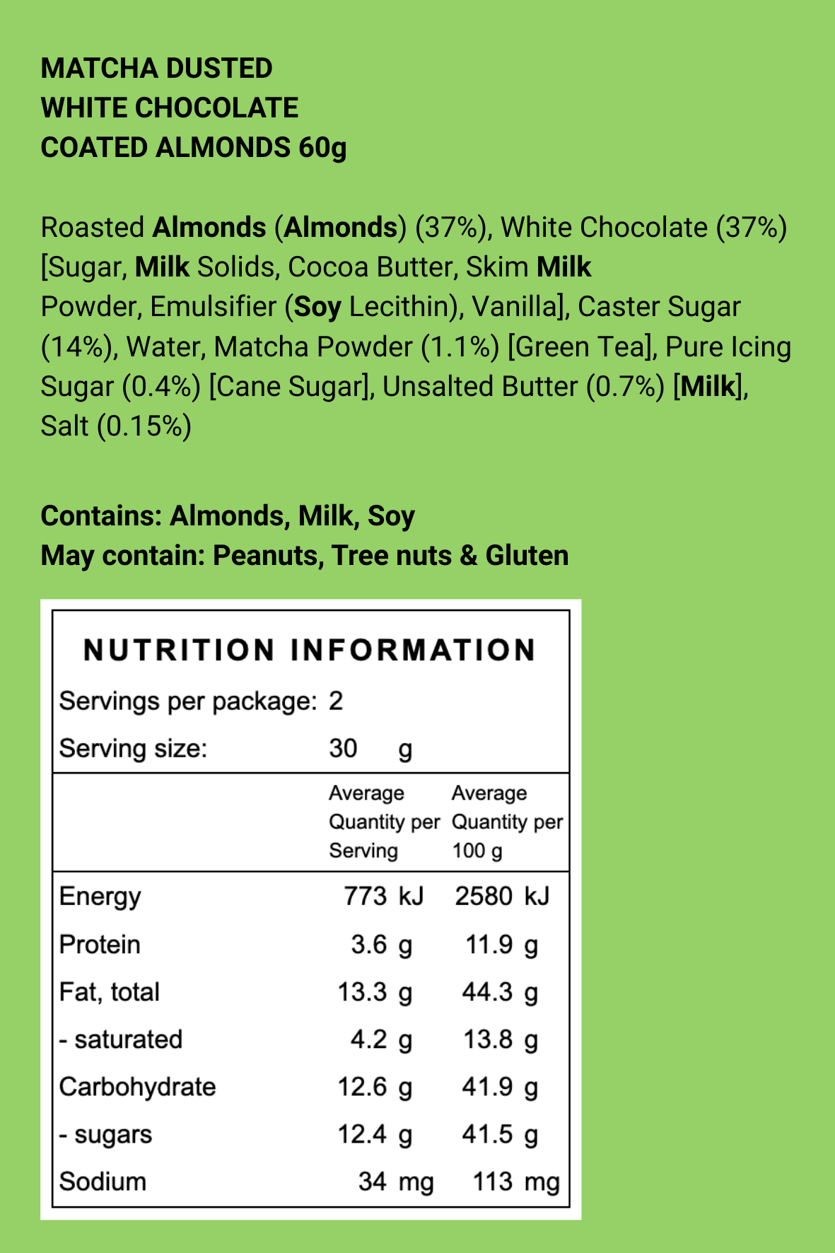 Small batch roasted almonds coated in golden toffee crunch, tumbled in creamy matcha-infused white chocolate, and dusted with premium Japanese green tea powder.